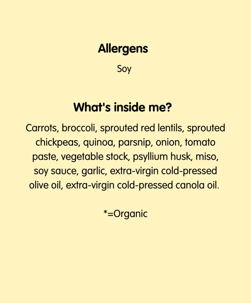 Sprouted red lentils, sprouted chickpeas, quinoa*, parsnip, onion, tomato paste, parsley, vegetable stock, psyllium husk*, miso*, soy sauce*, potato starch, garlic, extra-virgin cold-pressed olive oil*, extra-virgin-cold pressed canola oil*. *Organic