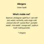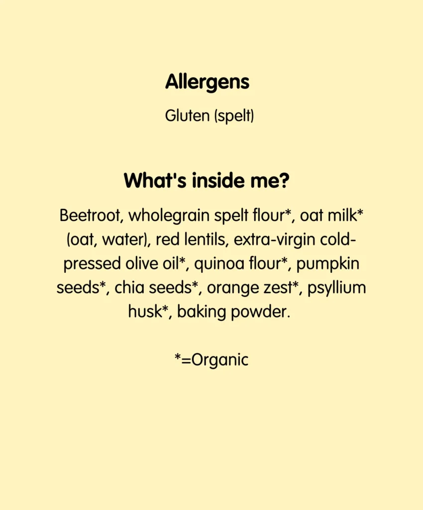 Beetroot, wholegrain spelt flour*, oat milk* (oat, water), red lentils, extra-virgin cold-pressed olive oil*, quinoa flour*, pumpkin seeds*, chia seeds*, orange zest*, psyllium husk*, baking powder. *=Organic