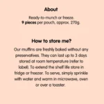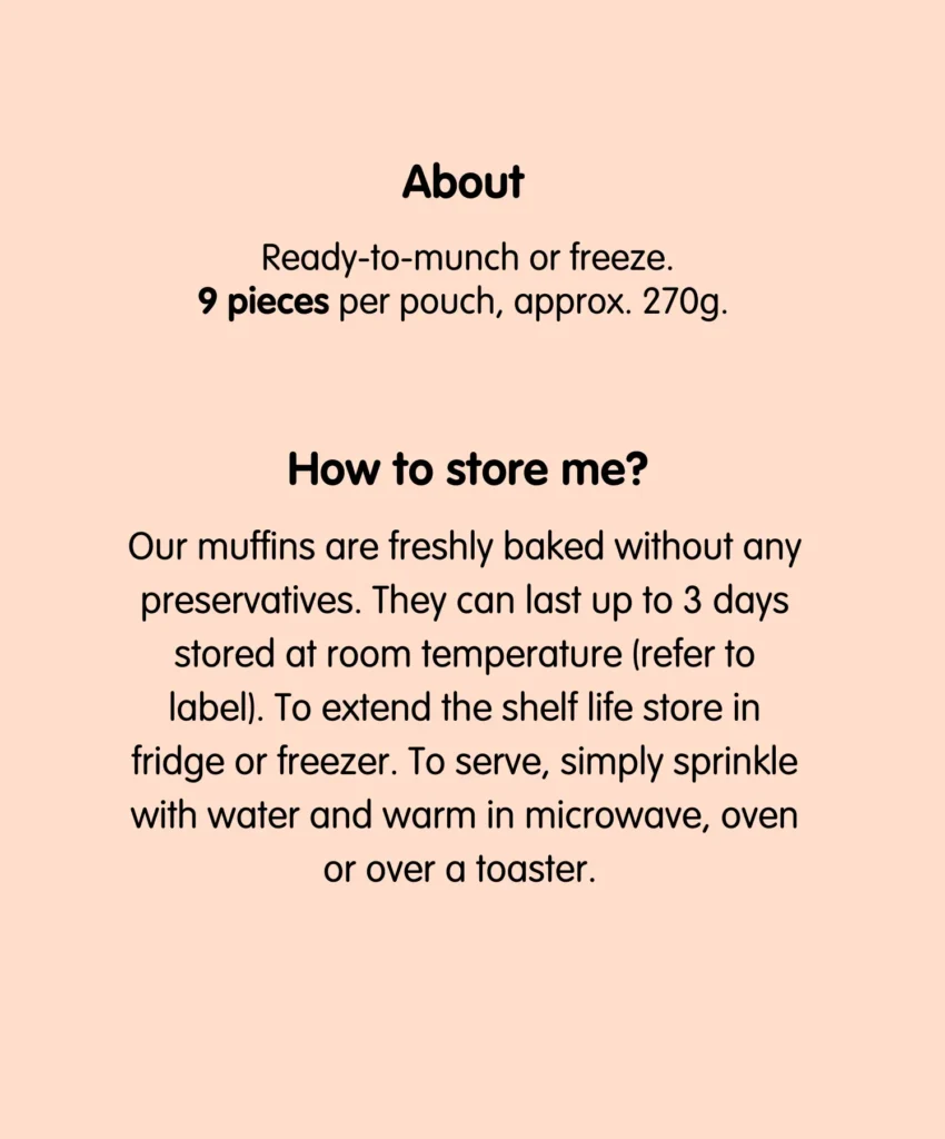 Our muffins are freshly baked without any preservatives. They can last up to 3 days stored at room temperature (refer to label). To extend the shelf life store in fridge or freezer. To serve, simply sprinkle with water and warm in microwave, oven or over a toaster.