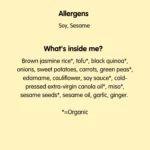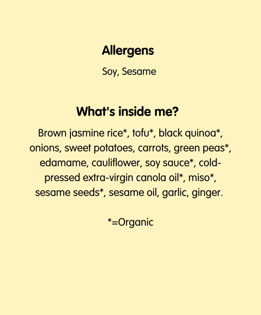 Brown jasmine rice*, tofu*, black quinoa*, onions, sweet potatoes, carrots, green peas*, edamame, cauliflower, soy sauce*, cold-pressed extra-virgin canola oil*, miso*, sesame seeds*, sesame Oil, garlic, ginger. *=Organic