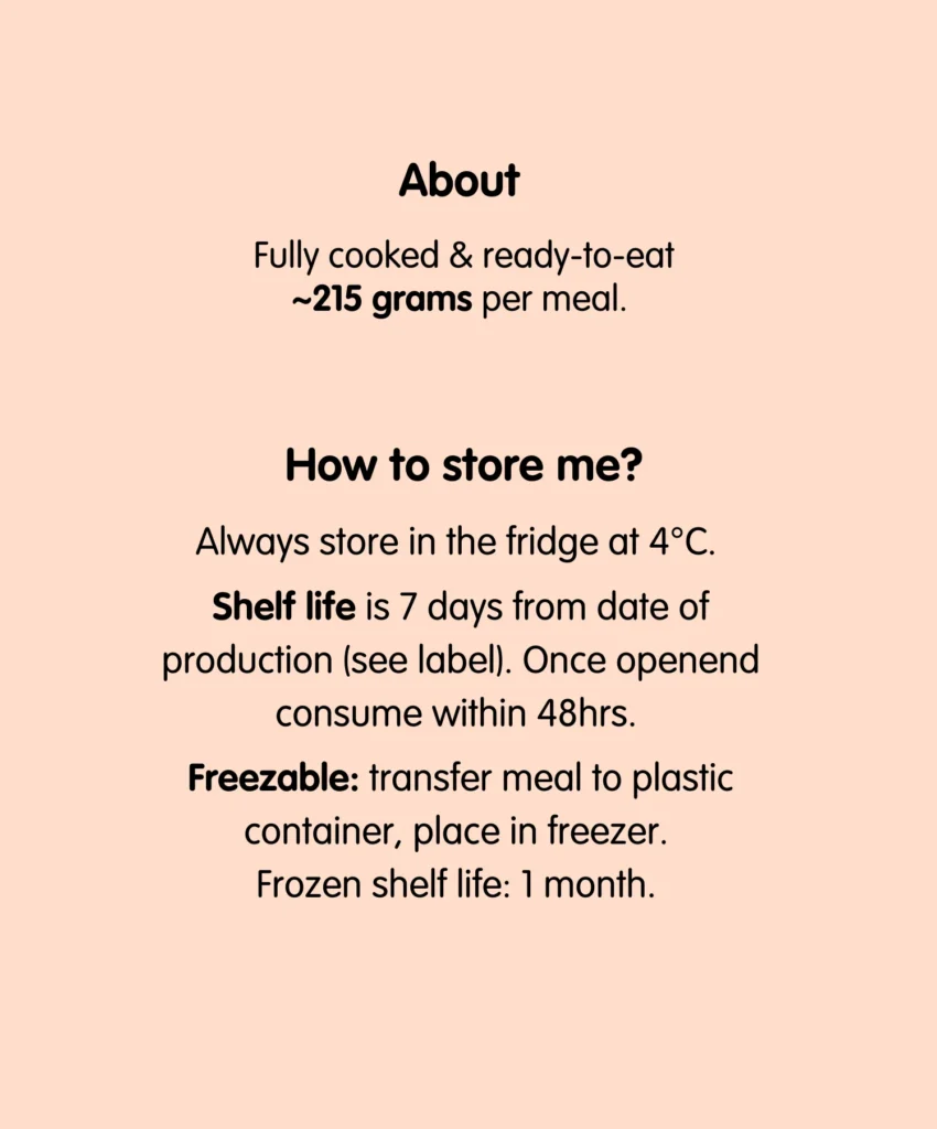 Always store in the fridge at 4°C. Shelf life is 7 days from date of production (see label). Once openend consume within 48hrs. Freezable: transfer meal to plastic container, place in freezer. Frozen shelf life: 1 month.