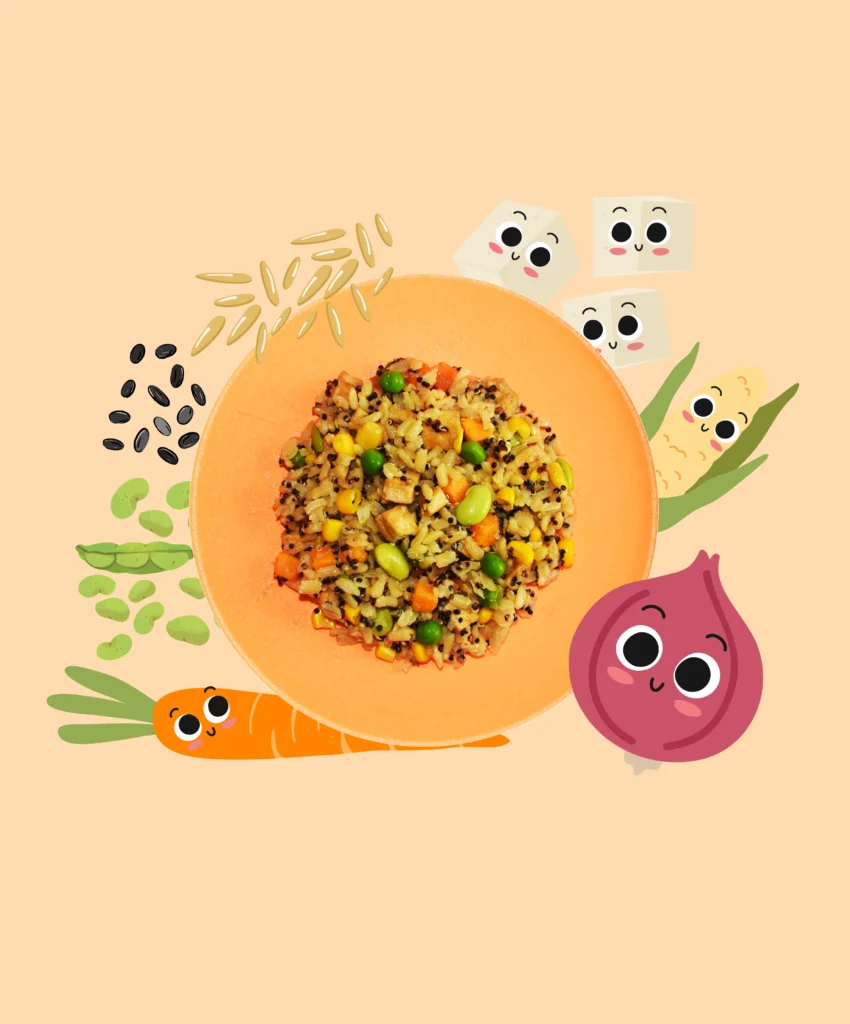 Asian-inspired not-fried rice packed with veggies, black quinoa, brown rice, and tofu, all finished with a hint of sesame for extra flavor.
