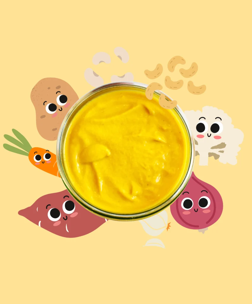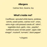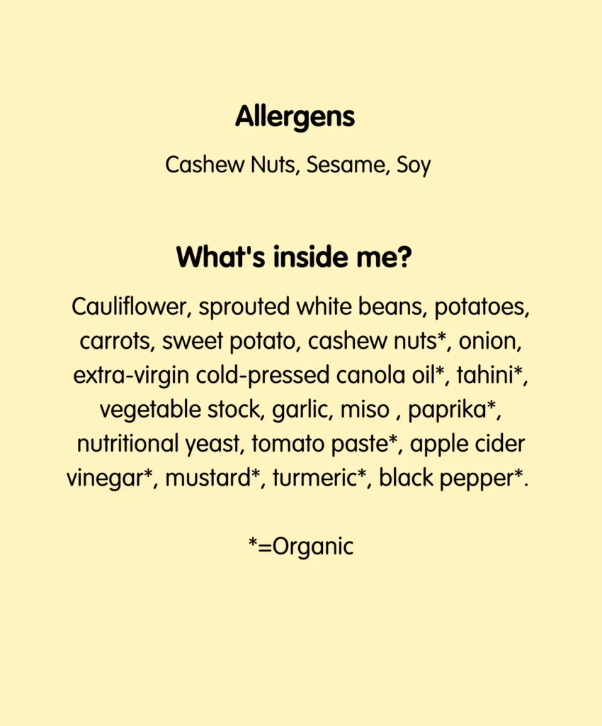 Cauliflower, sprouted white beans, potatoes, carrots, sweet potato, cashew nuts*, onion, extra-virgin cold-pressed canola oil*, tahini*, vegetable stock, garlic, miso , paprika*, nutritional yeast, tomato paste*, apple cider vinegar*, mustard*, turmeric*, black pepper*. *=Organic
