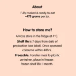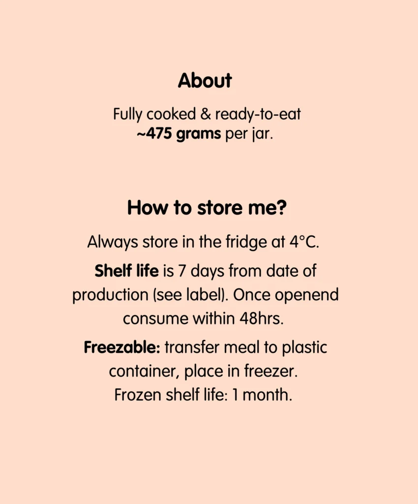 Always store in the fridge at 4°C. Shelf life is 7 days from date of production (see label). Once openend consume within 48hrs. Freezable: transfer meal to plastic container, place in freezer. Frozen shelf life: 1 month.